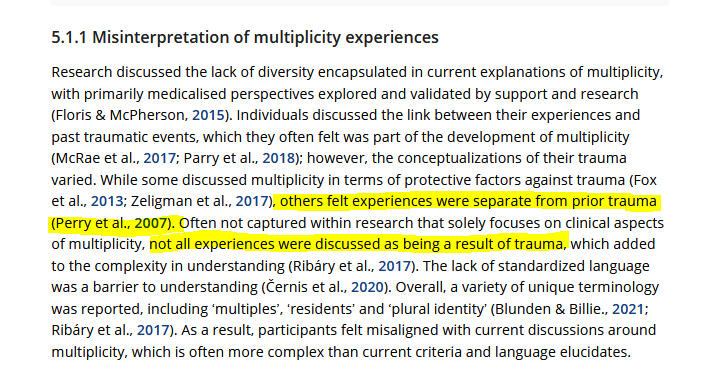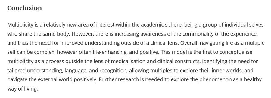 Description: This study interviewed many people who identified as multiple mainly non-pathologically. They emphasise that DID is not the same as this multplicity experience. They conclude that there are four categories of important factors that may contribute to how multiples feel and conceptualise themselves.
