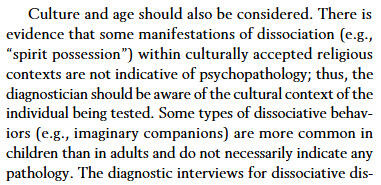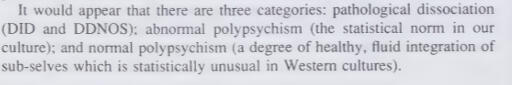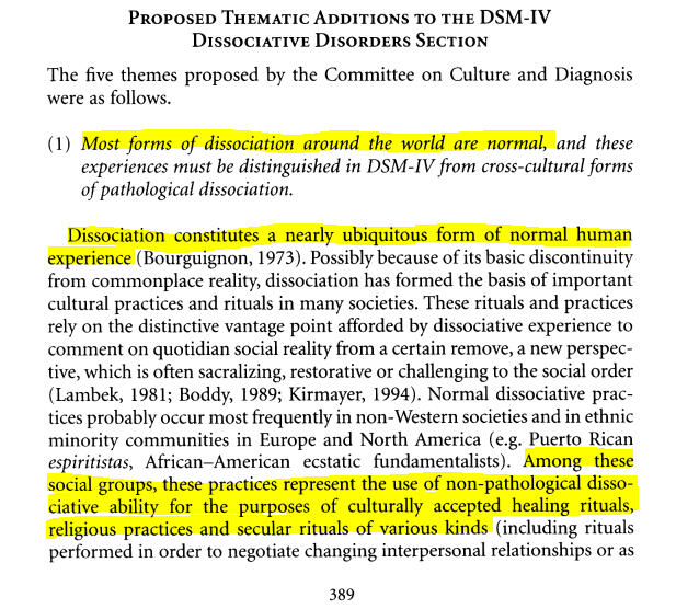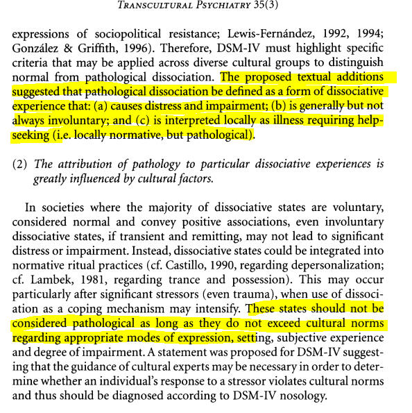 Description: Addresses concerns that the DSM-IV criteria for DID does not properly address non-pathological dissociation considered a part of normality in many cultures. Here it mentions that in some cultures dissociation in rituals and practices is normal and not pathological. I believe that this same view could also be applied to types of western endogenic plurality, as these also could be influenced by cultural factors as a form of dissociation that is not pathological.