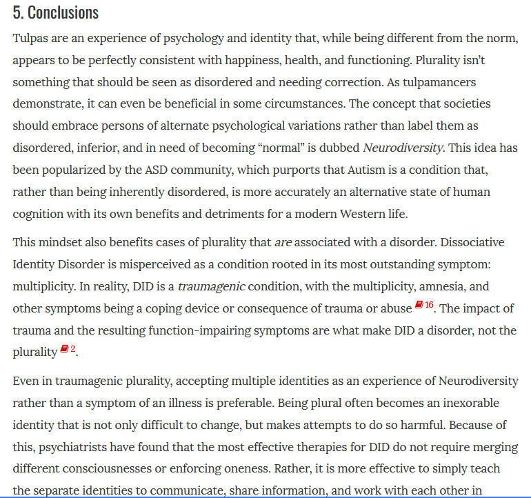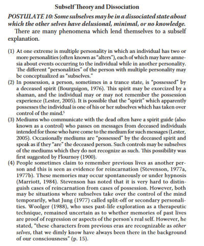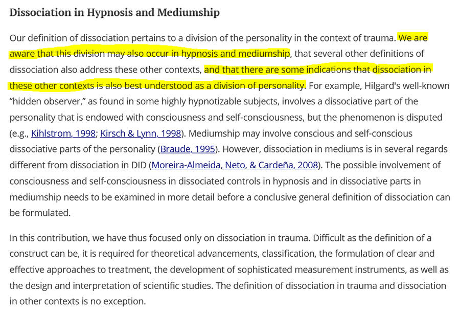Description: The relevant section here is at the very bottom of this article, here they talk about plurality outside of trauma in mediumship and hyponosis. It is interesting to not that these professionals were largely the authors behind the Haunted Self & the main traumagenic "theory of structural dissociation", the fact that they support this idea, says a lot.