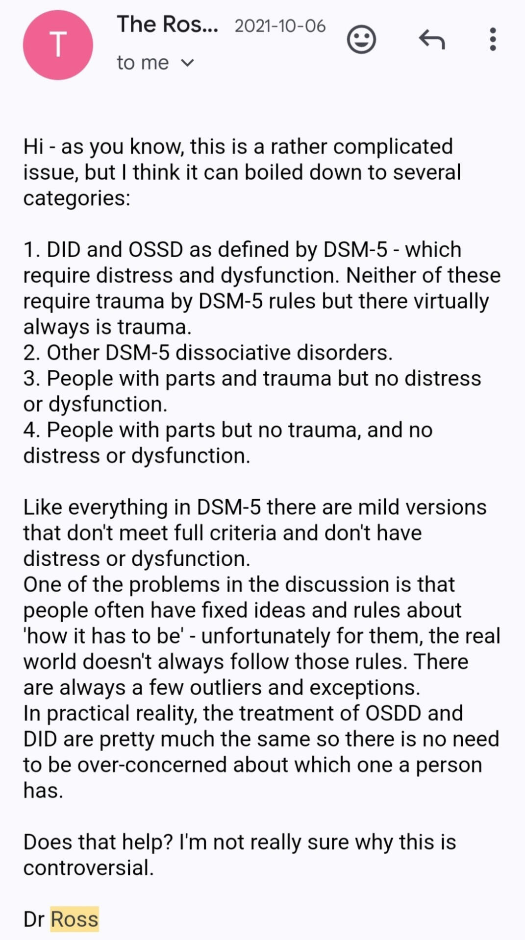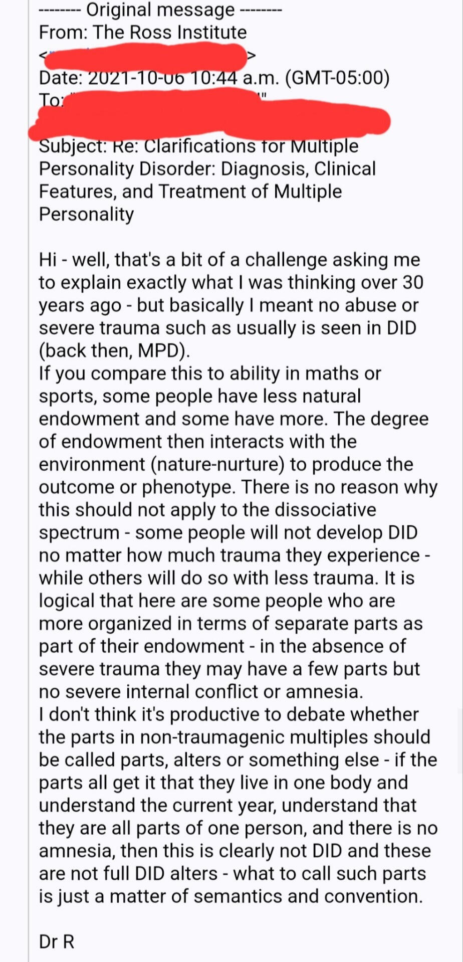 Description: Tumblr user sysmedsaresexist emailed Dr. Colin Ross about this subject, his answer was quite clear in saying that people with parts and no trauma can exist. Ross is a very respected and knowledgable professional in this subject.