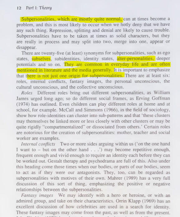 Description: This book is fantastic for talking about plurality not just in DID but in many different situations. It mentions the theories of dozens of psychologists which include the experience plurality-- not just in DID or pathology --showing that this subject IS well studied. A lot of these experiences and theories are remarkably similar to what endogenic systems commonly purport online as I will show in screenshots below. Even though there are screenshots i implore you to access this resource yourself, it's great and has so many different viewpoints on this subject.