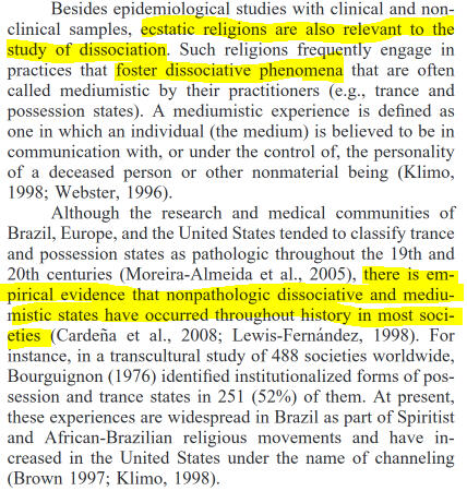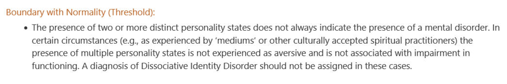 Description: The ICD-11 is the manual used by many countries in the world to diagnose conditions and diseases, the ICD-11's page on DID contains a section called "boundary with normality" that discusses experiences that may appear like DID, but are not pathological and shouldnt be diagnosed as DID, the example used here is mediumship, but note that they use "e.g." denoting it is only one example.