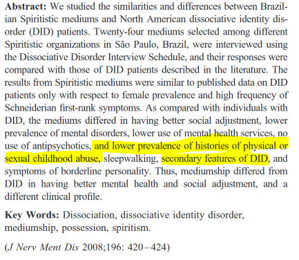 Description: Study about mediumship and a comparsion to those with DID, note that mediumship is being studied as a psychological dissociative phenomenon here and not particularly as a solely religious one, they are considering psychological explainations & factors. Though mediumship is often a spiritual experience I think the underlying psychological causes can be studied and equated to non-pathological/non-traumagenic plurality.