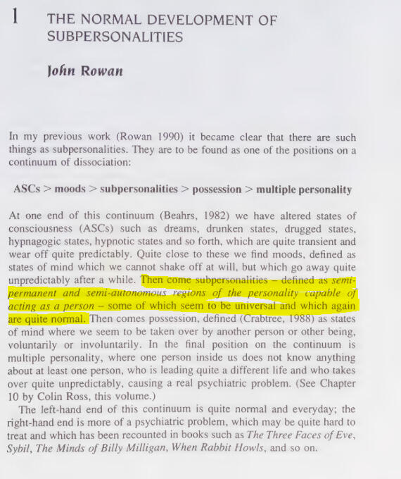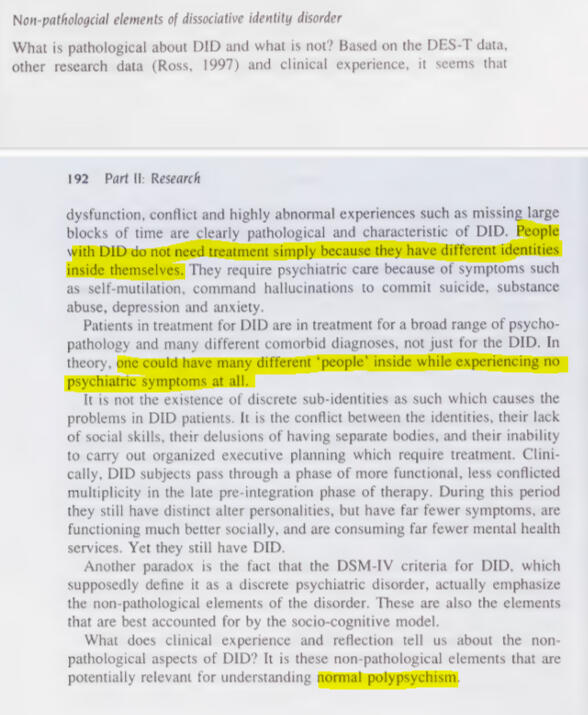 In Colin Ross' section he quite literally says "One could have many different 'people' inside while experiencing no psychiatric symptoms at all"