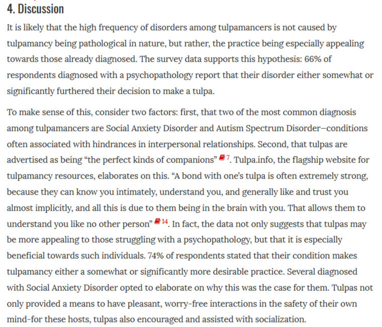 Description: Survey was sent out to multiple websites with users who practiced "tulpamancy", 62 responses are used in this study to formulate conclusions. 56% claimed to be diagnosed with mental illness, 78% claimed that their tulpa had helped their mental state, with no respondents saying that their tulpa had decreased their mental state, showing that tulpas are likely non-pathological and do not cause harm.